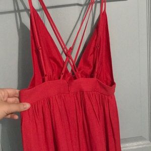 Red-pink strapping mini dress. Low cut with zipper and adjustable straps. Polyester fabric.