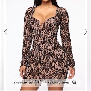 Sexy fashion nova mini dress. Taupe with beautiful black vine details throughout the dress. Flattering v bust line. Has zipper on the back.