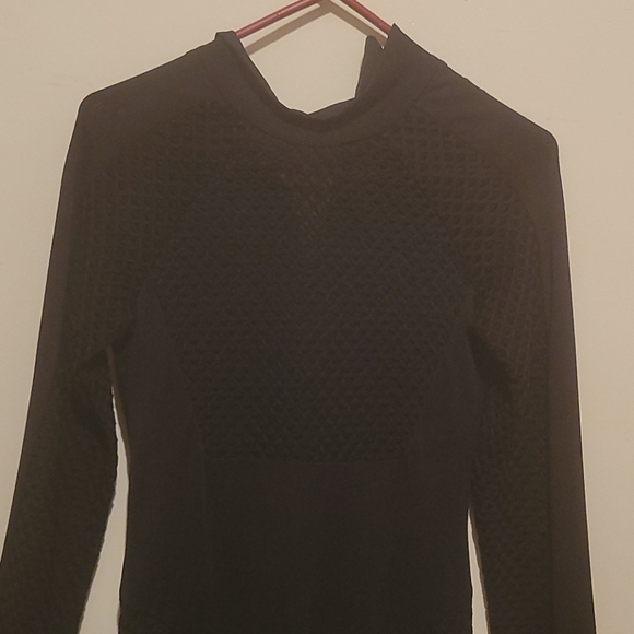 72% polyester 10% spandex and mesh. See through dress only on the mesh parts appx 21 inches in length. Very stretchy material