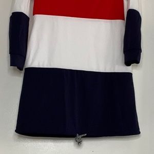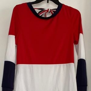 Never worn (bought through mail and runs small but never returned it). Tie goes in back with t shirt rounded neck in front. Polyester Nylon blend. Medium but runs small so fits a small. Has a draw string at bottom of dress. Red white and blue colors. Dress has pockets.
