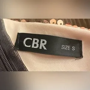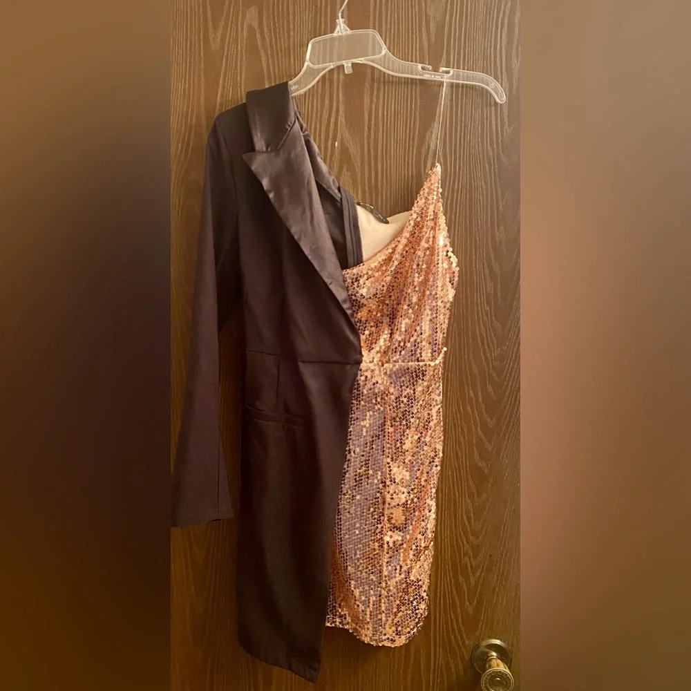 This dress is of a different style. Half tuxedo and half sequins. Mid thigh tin length. Fits more like a medium. Worn once in a phot shoot. Like new.