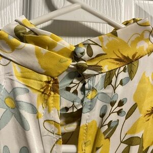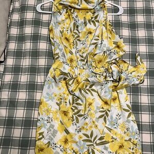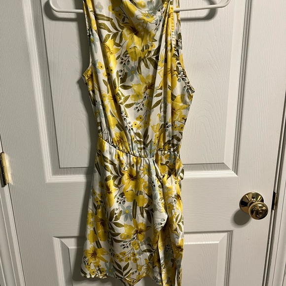 Brighten your wardrobe with this sleeveless floral dress, showcasing a lively yellow and white design. Ideal for warm weather outings.
