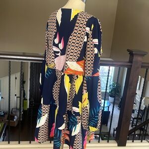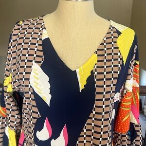 Long puffed sleeves, multi colored vee neck dress with a ruffled bottom, pull on easy dress made of lightweight Dacron (silky) Fits like a size 10, great vacation travel piece.