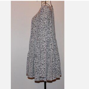 Easel oversize pullover mini dress/tunic top in a gray animal print pattern. Tiered, raw seams, polyester/spandex fabric. Size small, fits like medium/large, bust is 42", length is 27", sleeve length is 22". New with tag.