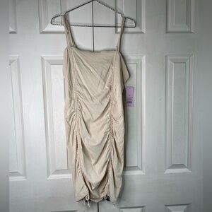 Features adjustable spaghetti straps and ruching. Dress can be adjusted in the length as well as straps.