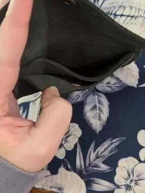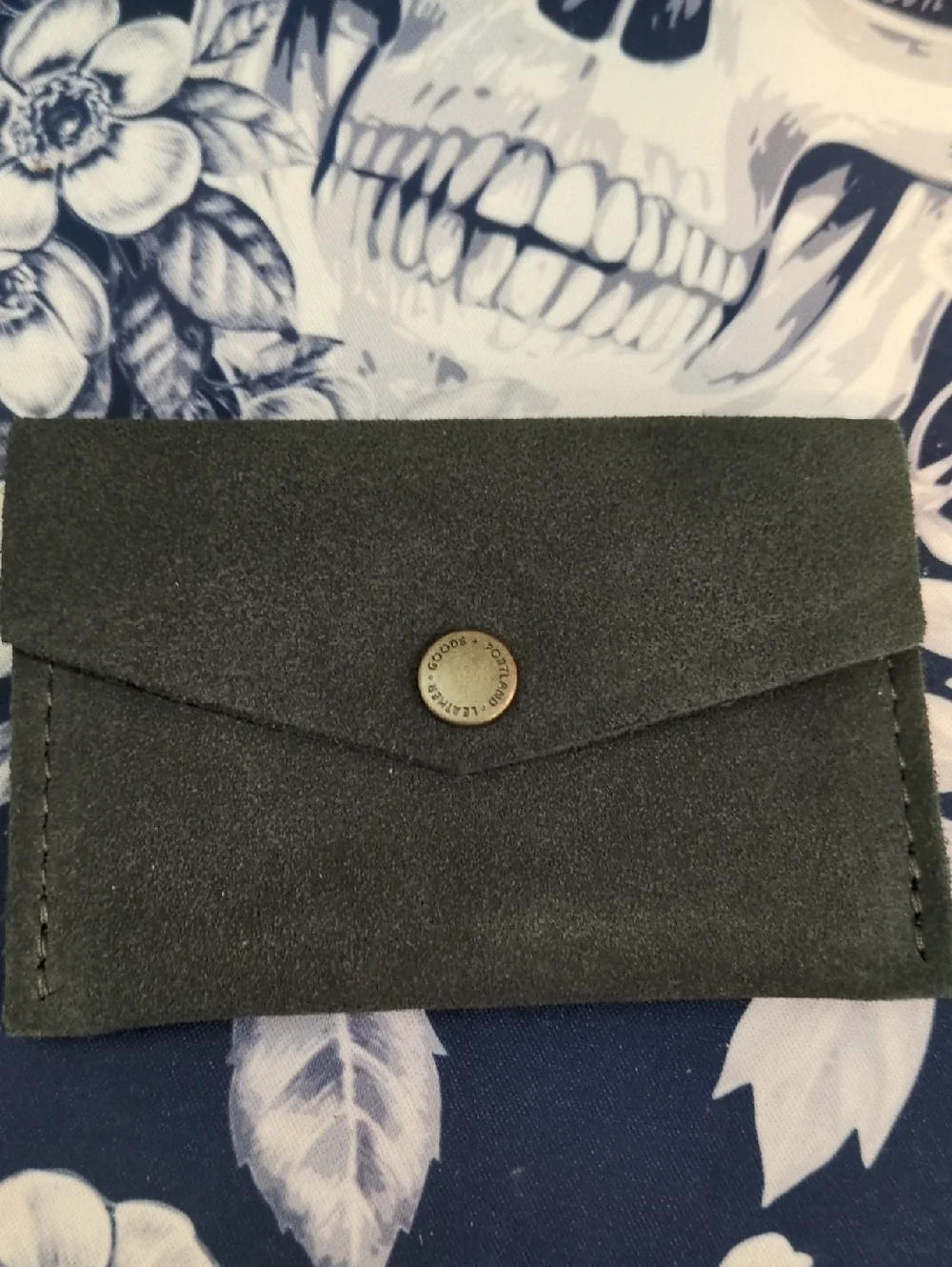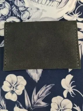 I am unsure of the color, but it is suede. Looks black or very dark blue. New, from a smoke free, pet free home.