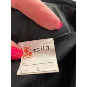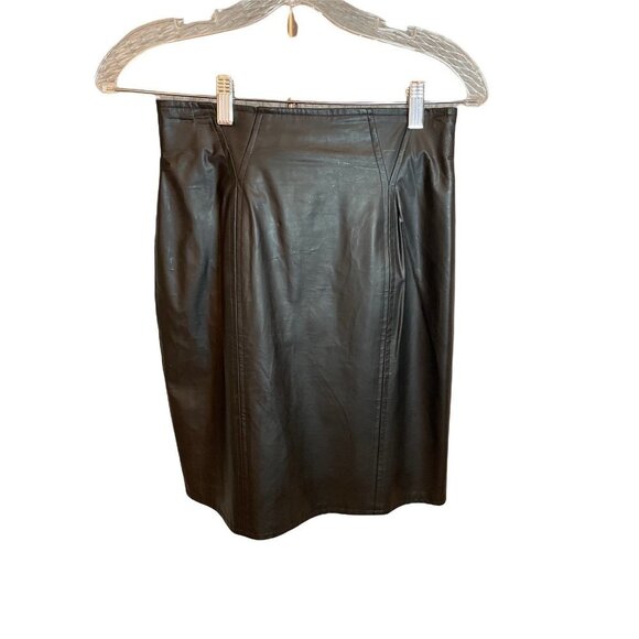 This black faux-leather mini skirt is adorable and has a couple of scratches, most noticeable near the accent belt on the back (see photos). The size tag is not US tag, so the size is incorrect. Please check measurements for accuracy of fit. This would likely fit an XS/S size.