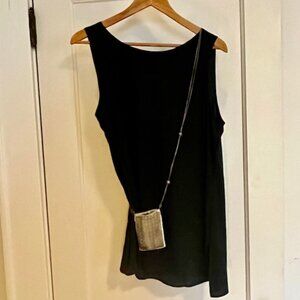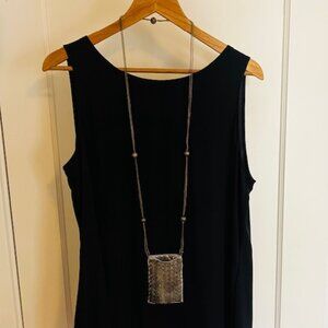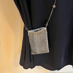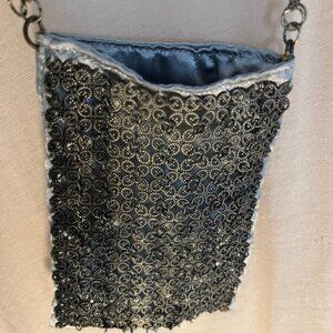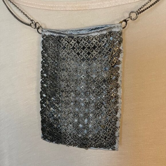 Antiqued filigree mesh over gray satin. Wear it as a necklace or a crossbody purse. Perfect for when you want to travel light in a stylish way. 40” double chain adorned with 5 scrollwork balls. Purse measures 4.25 x 3.25 inches.