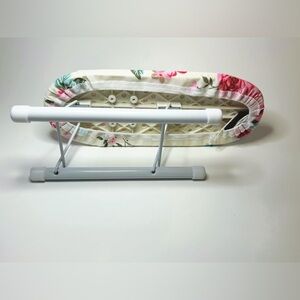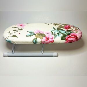 Mini ironing board with a floral design. Features pink and green flowers on a cream background.