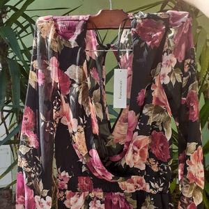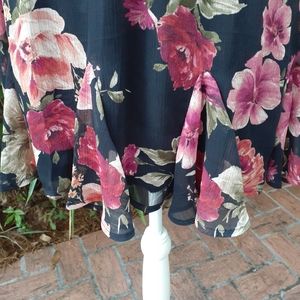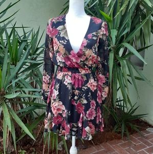 Francesca's Mi Ami pleated ruffle dress. Black and dark pink/mauves floral pattern. This has a very stretchy smocked waist and although this dress is size xxs It can fit an an xs as well. Very stretchy waistband.