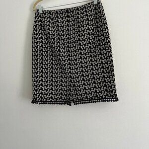 Sweet black and off white floral embroidered skirt. Pom Pom detail at bottom hem shows your playful side. Back zipper and fully lined with black cotton. Slit at back.