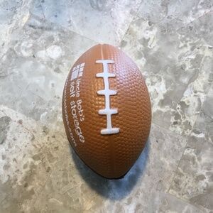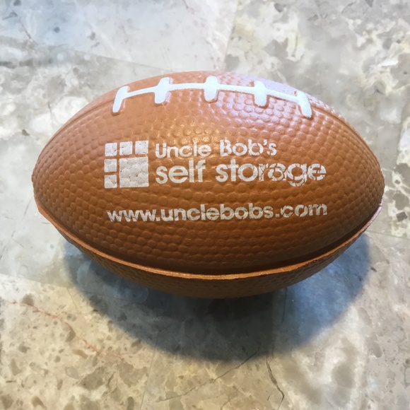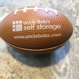 Mini Football with printed words Uncles Bob’s self storage www.unclebob.com. The football is ready for game day.