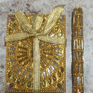 Elegant gold beaded notebook with matching pen. Features intricate beadwork and shimmering details. Perfect for gifting or personal use.