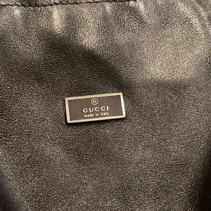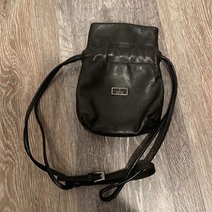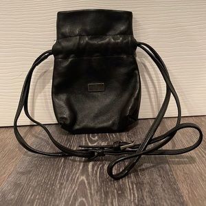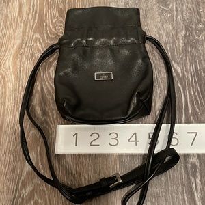 Black leather vintage Gucci mini drawstring pouch with silver-tone hardware, single flat shoulder strap, tonal nylon interior, single slit pocket and drawstring closure at top.