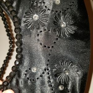 Small, black satin purse with sequin and bead details. Approximately 6" wide. Magnetic snap closure. Never been used.