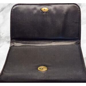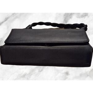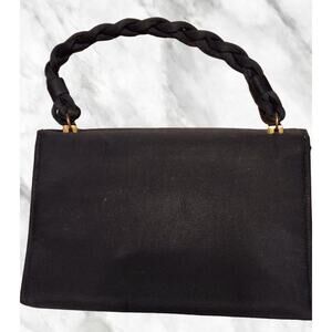 Mini, black, handbag. Measures 7 1/2" x 6" x 1 1/2". Inside of the purse is clean and has one side pocket. Magnetic snap closure and braided handle. Outside is most likely a nylon or rayon fabric. Feels silky.