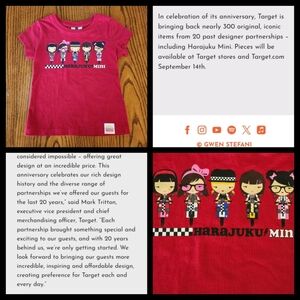Mini Harajuku 20th Anniversary Edition T Shirt. In celebration of Target's partnerships with so many designers over the last 20 years, they brought back limited editions of several designers. Included was Mini Harajuku! This adorable shirt is in excellent Pre-loved condition. Size 4/5. Please see pictures for more details.