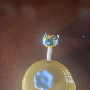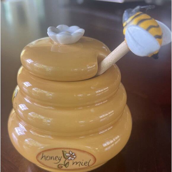 Mini Honey Pot Ceramic Jar & Wood Dipper Beehive with Bumble Bee Flower Lid