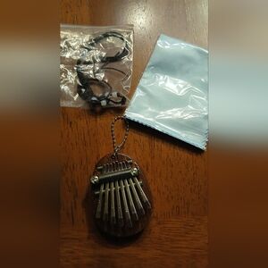 Finger and thumb 8 key piano marimba on genuine wood base comes with necklace and keychain attachments. Included is a polishing cloth and gift box.