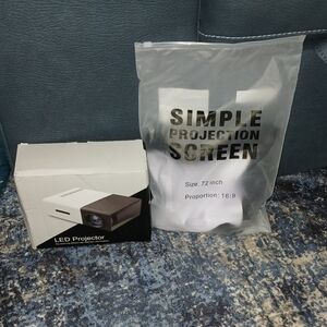 Compact LED projector with a 72-inch simple projection screen. Ideal for home entertainment.