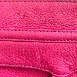 Rebecca mini M.A.C Crossbody is the brands signature brand. The vibrant hot pink is a perfect pop to add to your wardrobe. Back is used and has distressing on the corners as well as some fading of the pink. Inside has two pockets