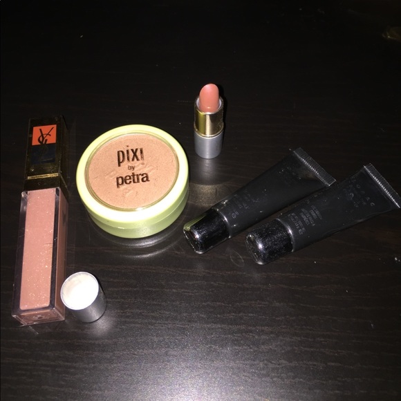 Two mini behind the scene primers (0.19oz EACH), one mini pixi bronzer in summertime (0.16oz), mini neutral lipstick in rio, brand unknown, and deluxe sample size of YSL lipgloss in an unknown shade but it's a light pink with a little shimmer! Mostly high end products!