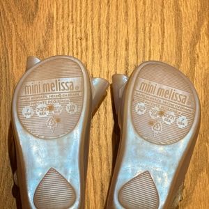 Adorable Mini Melissa baby shoes. Features a shiny bow. Pearl color with gold accents. Perfect for little feet.
