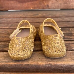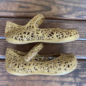 Mini Melissa + Campana Gold Glitter Zig Zag Mary Jane Shoes Baby Girls Size 9. Pretty gold glitter zig zag design. Have been worn, so normal wear, tear and dirt to the shoes, some tarnishing to the studs on the shoes, some of the gold and glitter has rubbed off on the toe area, and dirty footbeds - please see the pictures. Still smell sweet and have a ton of life left, but have been worn and do have some wear. Good Used Condition.