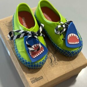 Vibrant green shoes with shark design. Blue accents and checkered laces.