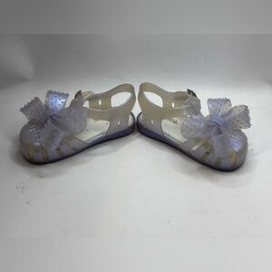 Adorable Mini Melissa sandals. Features a pearl white finish. Decorated with a bow and small studs. Perfect for any occasion.
