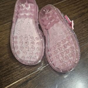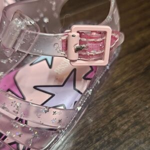 Charming pink sandals with glittery finish. Easy buckle closure. Perfect for playful days.