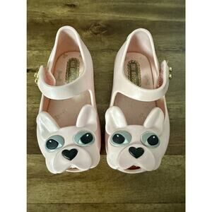 Mini Melissa Ultragirl Pink French Bulldog Mary Jane Shoes in Size 5. Good used condition for some light wear/marks on right shoe (see pictures). Super cute for your little girl or someone special!