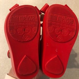 Absolutely adorable Mini Melissa’s little girls size 5. Worn a few times, a few scuffs on the gold hardware but not too noticeable! Still has that yummy smell, no box.