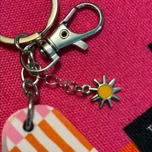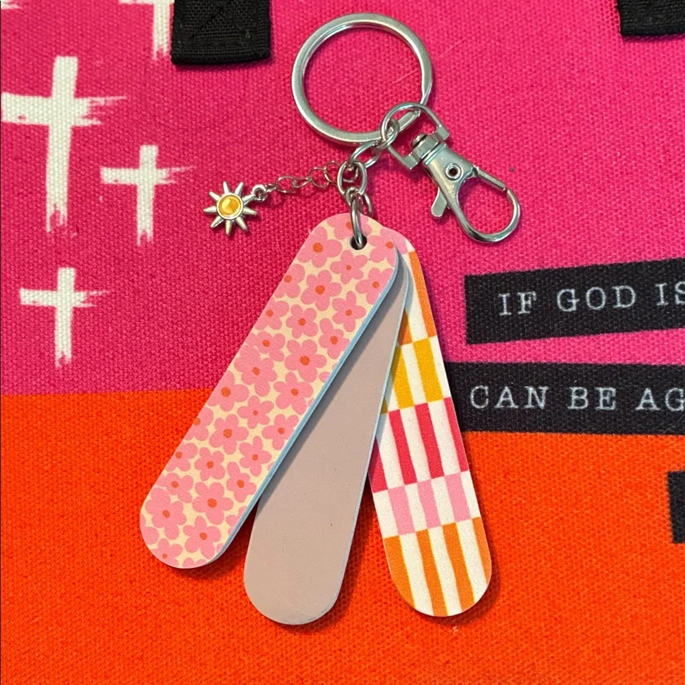 Charming pink and orange keychain. Includes 2 nail files and 1 nail buffer. Perfect for adding a touch of style to any bag or set of keys.