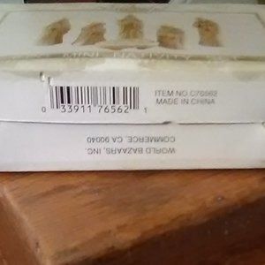 Vintage 90's... 6-piece Miniature Nativity Set...by Crown Accents for World Bazaar...#C76562...sizes range from 3.5"-2.5" high X 1" deep...porcelain with hand-painted gold accents...pre-loved good condition...no chips or cracks...original box...made in China.