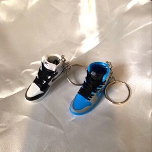Mini Nike sneaker keychains. Features black and blue colorways. Stylish and fun accessory.