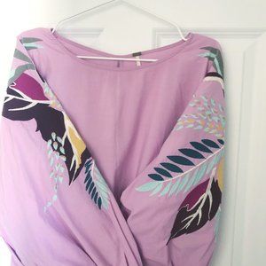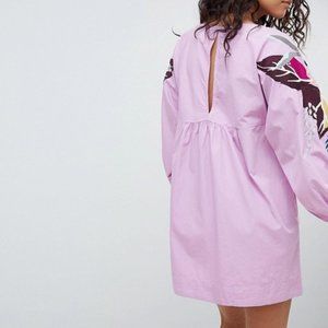 Poplin mini dress featuring wide statement sleeves accented with colorful embroidery detailing.