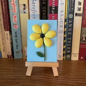 This very pretty miniature painting on stretched canvas measures 2.5 inches x 3.5 inches and comes with a display easel. The yellow flower is handmade with paper mache and displayed on a light blue background. A gift box is also included. This will make a very nice gift or look great on your desk, bookshelf, or kitchen counter!