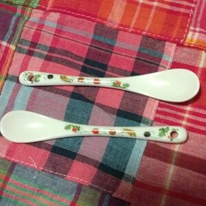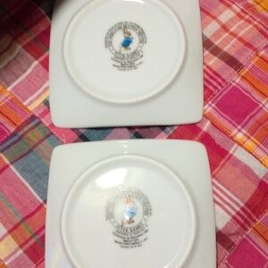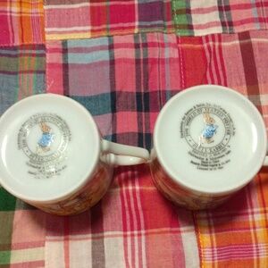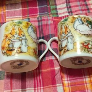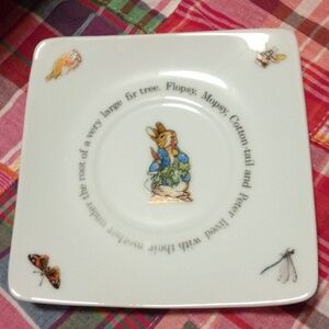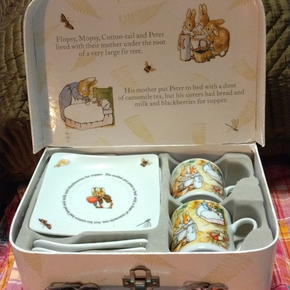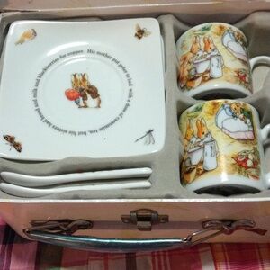 This little Peter Rabbit tea set is too cute! Decorated cardboard suitcase opens to reveal two cups,two saucers and two spoons,each made of porcelain and beautifully decorated with Beatrix Potter's sweet bunny characters. In excellent condition,no chips or stains. Case shows wear but is in good condition. Measurements approx: Plates: 4"×4",Cups: 2" tall, Spoons:3 1/2' long, Suitcase: 8"×5 1/2"×3".Will be safely and securely packaged and shipped.