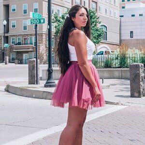 The Mini Plum Tulle Skirt is above knee length, 19inches/50cm from the waist down.