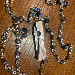 The Rosary contains multi shade shimmer square glass beads. The center of the rosary has a Mary charm that the real mini pink and silver pocket knife hangs from. Please note that this is a real knife. Handle with caution.