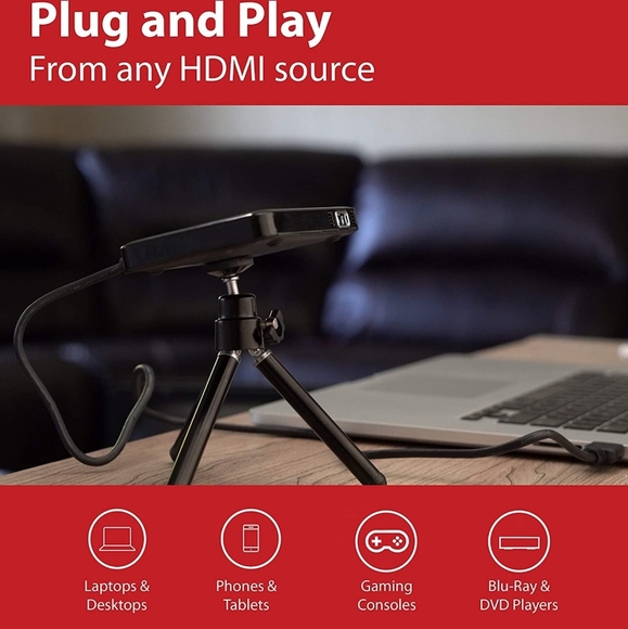 Comes with HDMI, Micro HDMI, MHL cables & Samsung Galaxy adapters that allow you to project from your smartphone, tablet, laptop, media player & any other HDMI video player (Note: Apple devices require an adapter - sold separately, Android devices require MHL feature - see your device's manual for compatibility)