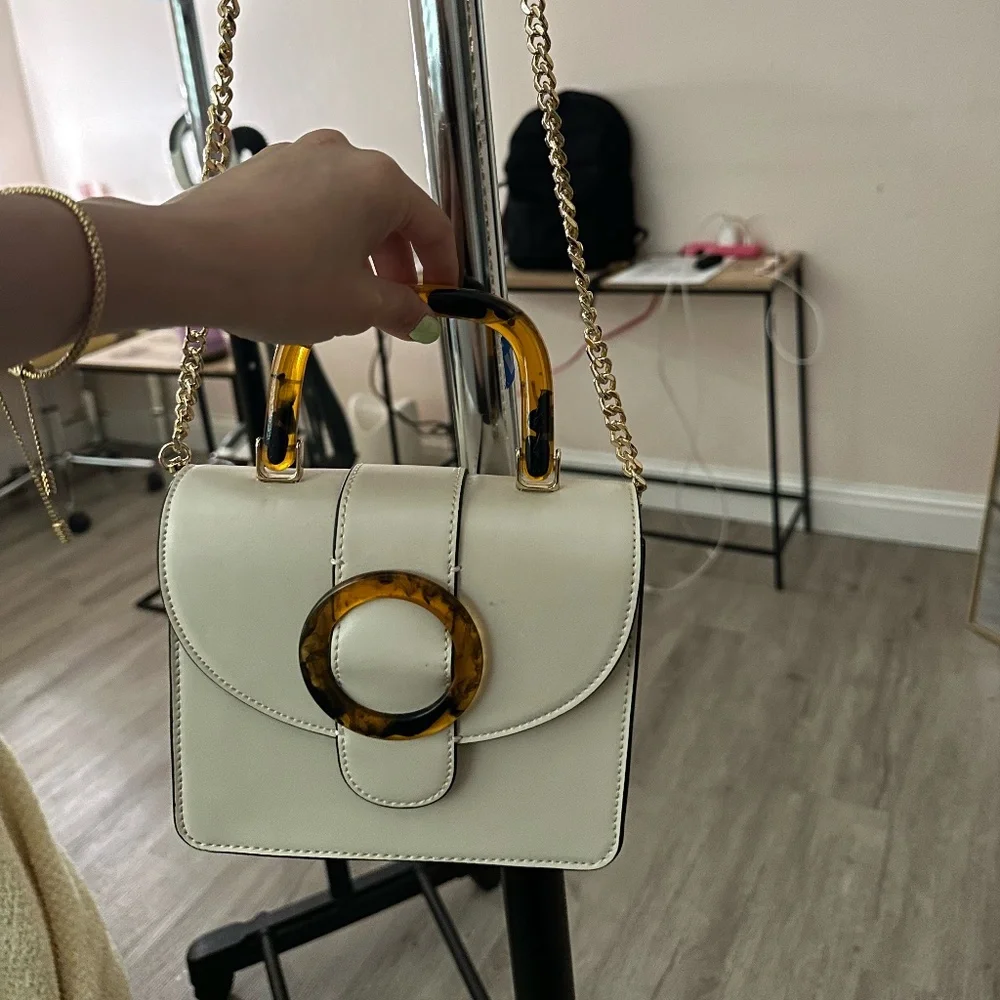 Cute square small leather purse with gold chain and brown detailing.
