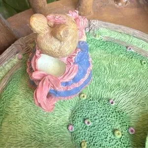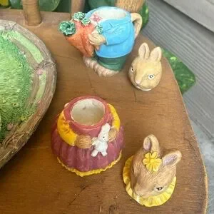 •Cute little resin tea set with a 5.25” plate that holds 2 cups & saucers with bunny teapot, creamer & sugar.