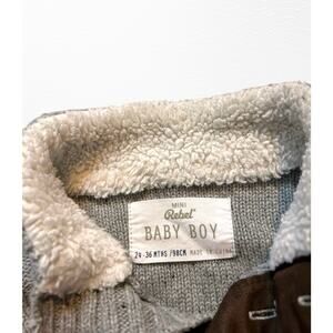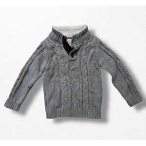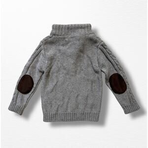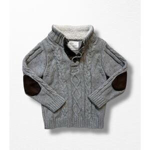 Marled gray cable knit sweater from Belgian brand Mini Rebel in size 24-36 months. Pullover design, 3 button sherpa-lined collar, faux suede elbow patches. 100% cotton, machine washable. In excellent pre-loved condition.