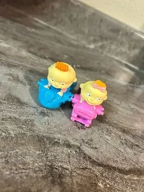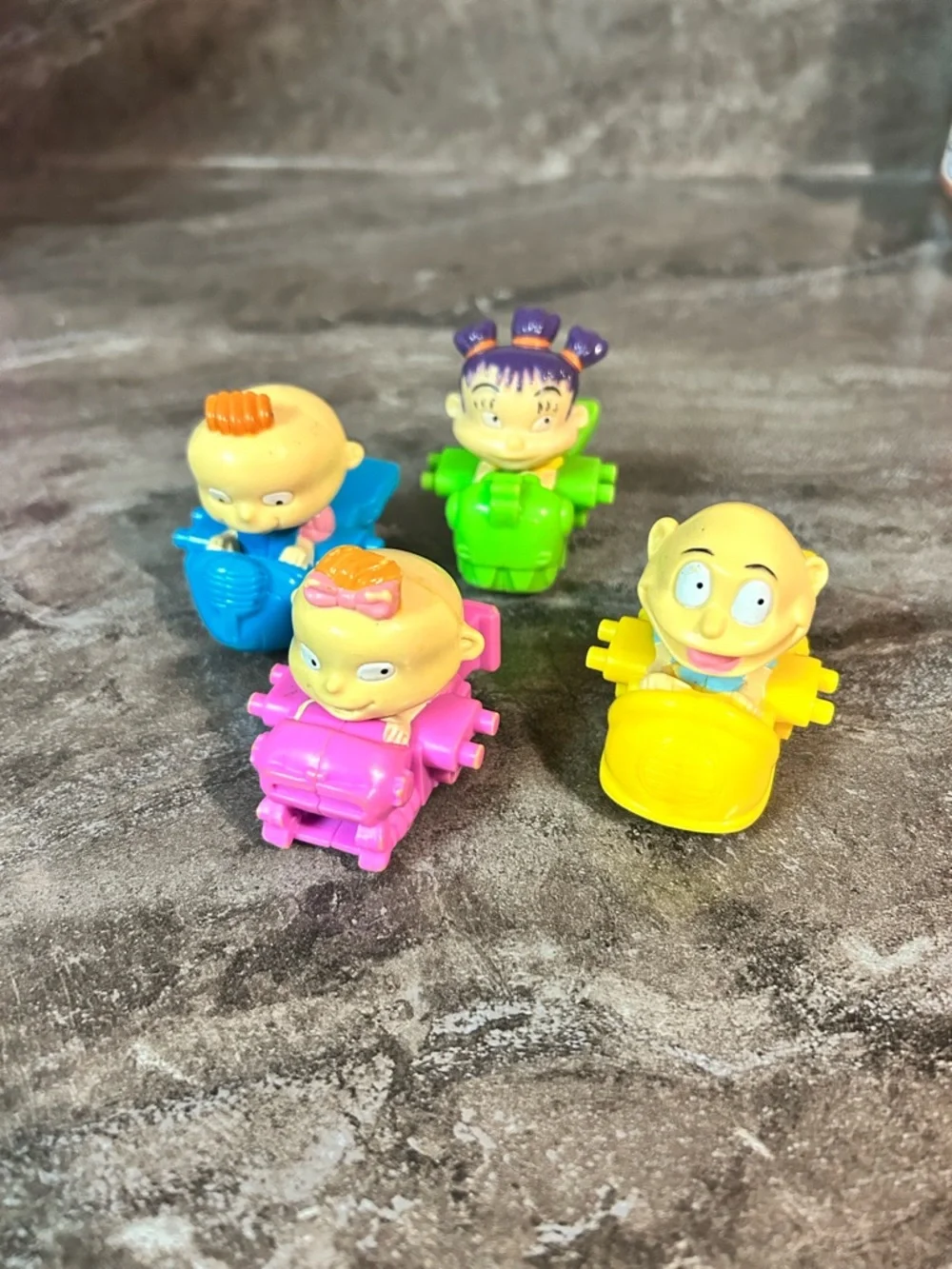 Four collectible mini ride-on baby figurines in yellow, pink, blue, and green. Bright colors stimulate imaginative play and group storytelling. Durable plastic construction for everyday fun. Small, detailed figures designed for easy handling and creative scenes.
