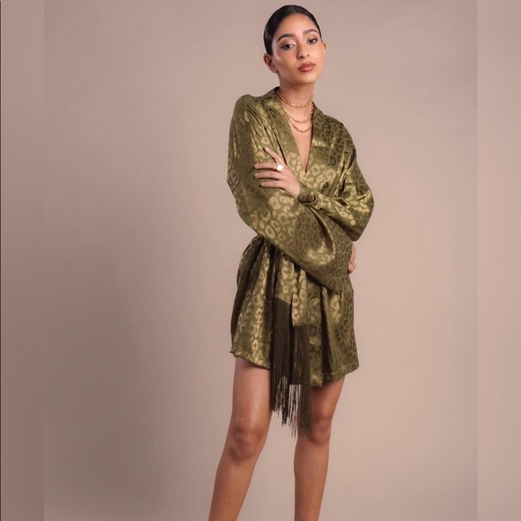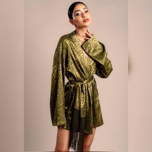 Mini Robe Dress with Long Sleeves and fringed wide Belt in Emerald Green Jacquard