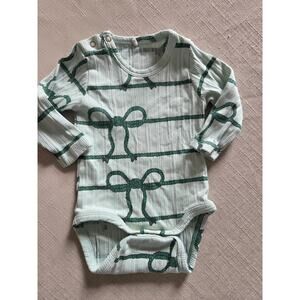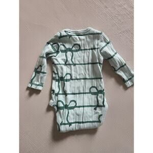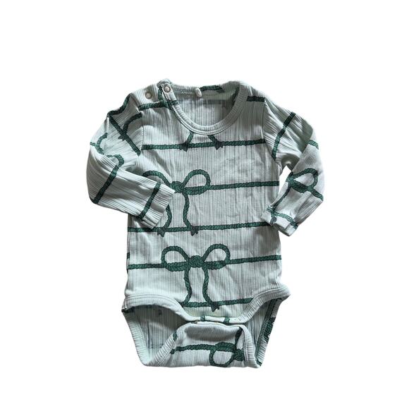 Green long sleeve bodysuit with an all over Rope print, made from GOTS certified organic cotton with stretch. The bodysuit features snap buttons at the shoulder and crotch for easy dressing.
