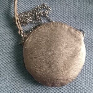 NWT, silver leather Noelle wristlet & shoulder bag. Measures 6 inches round with 48 inch chain cross-body strap