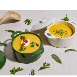 Mini round ceramic cocotte set. Features a playful design with broccoli graphics. Perfect for cooking and serving.
